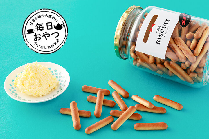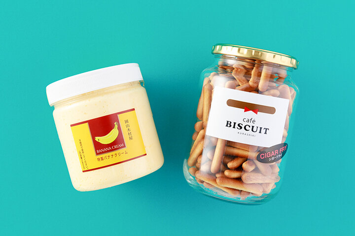「梶谷のシガーフライ」の通称で、岡山で親しまれているフィンガービスケット。小麦粉をじっくりと練り上げる昔ながらの製法の生地を、高温のオーブンでこんがり焼き上げています。サクッとした食感で香ばしく、ほんのり甘さが感じられる生地にまぶされた瀬戸内の塩がアクセント。素朴な味ながら「食べだしたらやめられない」と、親子三世代に渡り愛される味わいです。 ご紹介する「シガーフライ&特製バナナクリーム」は、梶谷食品直営の、倉敷にあるカフェ「café BISCUIT」で限定販売されている瓶入りビスケットと「特製バナナクリーム」の組み合わせです。