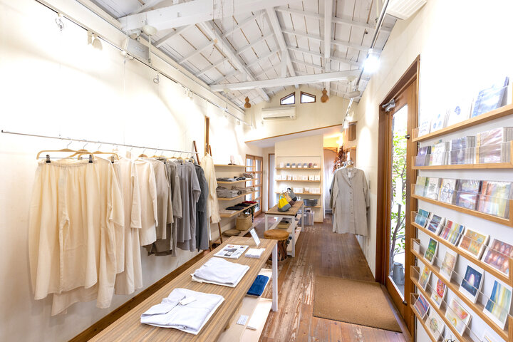 逗子駅からバスに揺られ、元町バス停で下車。森戸海岸に流れ込む森戸川の川沿いに建つ木造の平屋が「Life afa」のショップ&ギャラリーです。小さなお店なので通り過ぎてしまいそうになりますが、入口のすぐ横にそびえるシンボルツリーのような大きなタブの木が目印です。 ブランドをプロデュースしているのは、葉山在住のデザイナー真砂三千代さん。アジアやアフリカの伝統的な布を使ったブランド「Afa」(古代語で太陽の意味)を主宰していた真砂さんは、ゆったりとした葉山暮らしの中でよりナチュラルなものづくりをしたいと、約20年前にオーガニックコットンで作る日常着ブランド「Life afa」を新たにスタートさせました。