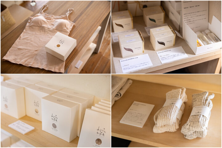 (左上)パット付きキャミソール4070円(左下)タンクトップやハーフトップブラなども(右上)オリジナルレシピで作られる「Amarma Ayurveda」の石けん(右下)オーガニックコットンの落ち綿を使った「Organic Garden」の靴下