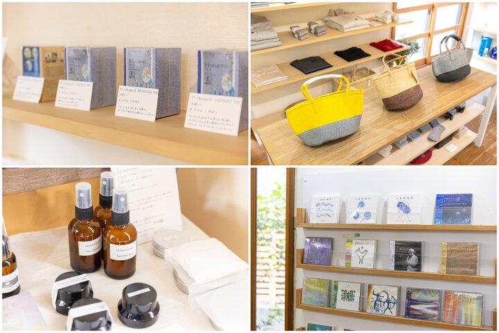 (左上)ゾネントア社のオーガニックハーブティー972円〜(左下)オーガニック植物オイルを配合した「栞草」のフレグランス1100円(右上)アフリカで作られたサイザル麻のバスケット7150円(右下)真砂さんのご主人であるアーティストの真砂秀朗さんが手掛けた環境音楽のCDもある