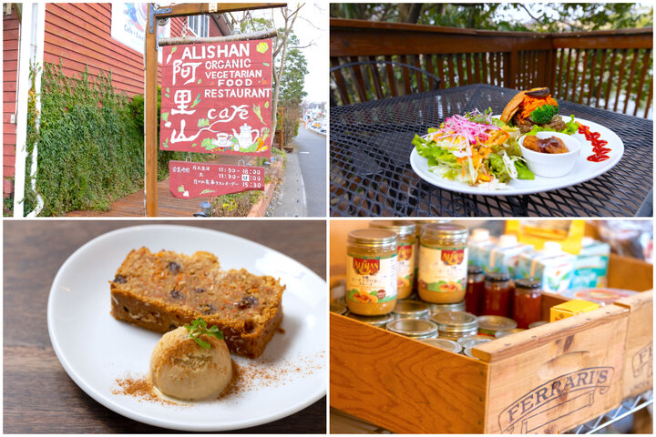 曼珠沙華の名所としてにぎわう巾着田のすぐそばにある「阿里山Cafe」は、ベジタリアン&オーガニックのランチやスイーツがおいしいと評判のカフェ。オーガニック食品がずらりと揃うショップが併設されていて、食後のお買いものも楽しみです。