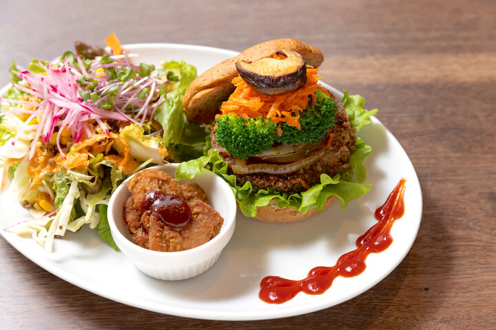 「ローストベジタブルピザ」や「お豆と季節野菜のカレー」など、フードメニューはどれも野菜たっぷりでボリューム満点。肉や魚を使わないベジタリアンメニューながら満足度は抜群です。 中でも人気なのが定番メニューの「ベジバーガープレート」。野菜と穀物で作られた分厚いパテは、中に入っているひき割り小麦がまるで粗挽き肉のような食感です。おいしくて、食べ応え十分。お肉が苦手な人や、カロリーが気になるダイエット中の人にもおすすめの一品です。