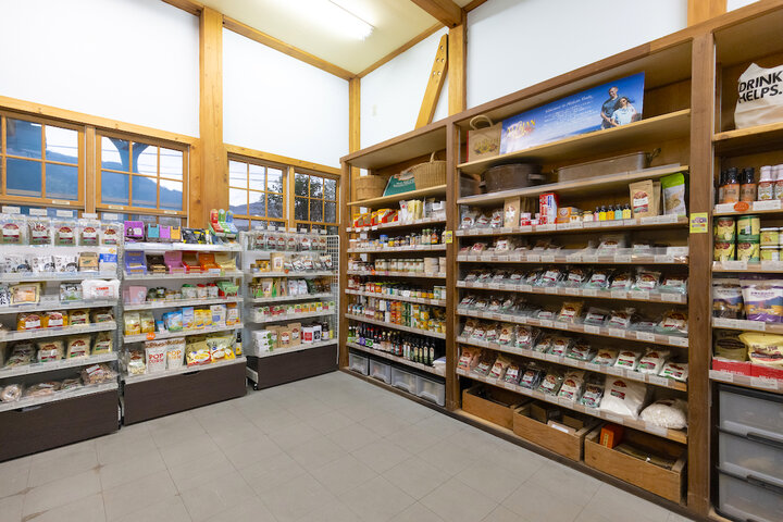 棚には茶葉や粉類、豆、ドライフルーツなどがずらり。冷凍食品やチョコレートも