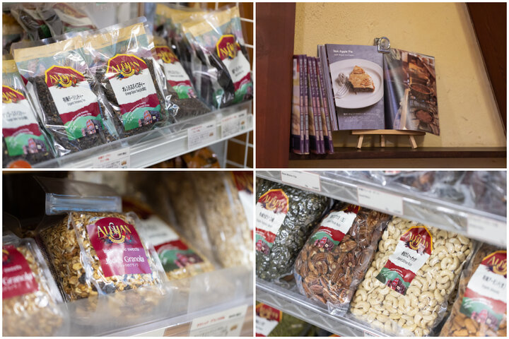 (左上)種類豊富なハーブティーや紅茶(左下)朝食用にグラノーラはいかが?(右上)カフェのレシピ本も販売(右下)オーガニックのナッツ類