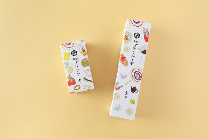 ブランデーケーキといえば、ずっしり濃厚な食べごたえ。その価値観をくつがえすブランデーケーキを鳥取で見つけました。手がけるのは創業150年以上の老舗「亀甲や」。看板商品の「亀甲最中」で知られる鳥取の和菓子店です。 まず心惹かれるのが箱のデザイン。手書きのイラストにレトロな書体が印象的で、手に取ってじっくり眺めてしまいます。松葉蟹に二十世紀梨、民藝の器も。そんな鳥取ならではの箱のイラストを見ているとますます旅情がかきたてられます。