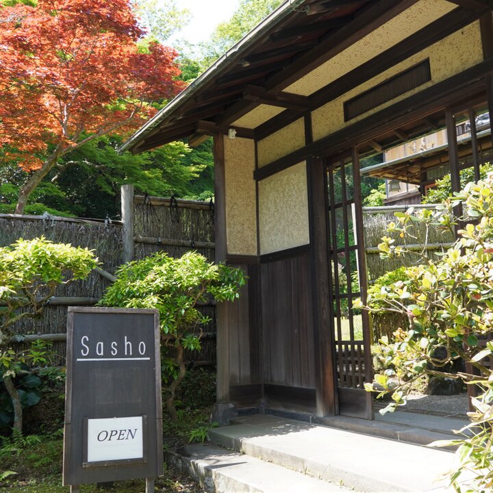 鎌倉駅西口から北鎌倉方面につながる扇ガ谷は、幹線道路から一本入ると生垣のある大きな一軒家が続く静かな住宅街です。昭和の一時期は政財界人の別荘地としても人気になったエリアで、そうした地域にある「Sasho」も細い路地を登った一番奥にある由緒あるお屋敷です。