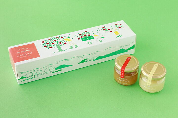 福島県で果樹園を営む「大野農園」で栽培している果実は、創業当時から作り続けているりんごと桃、梨、ぶどう。土づくりから妥協せずに栽培した極上のフルーツを旬以外にも楽しんでほしいという思いから、収穫した果実をお菓子やジュースなどに加工しています。 パッケージには栽培から収穫、運搬、選果、調理、加工とお菓子ができるまでのプロセスが、やさしいタッチのイラストで描かれています。側面には広大な果樹園から見渡せる阿武隈山系も描かれ、自然豊かな農園で丁寧に作られている様子が目に浮かぶようです。