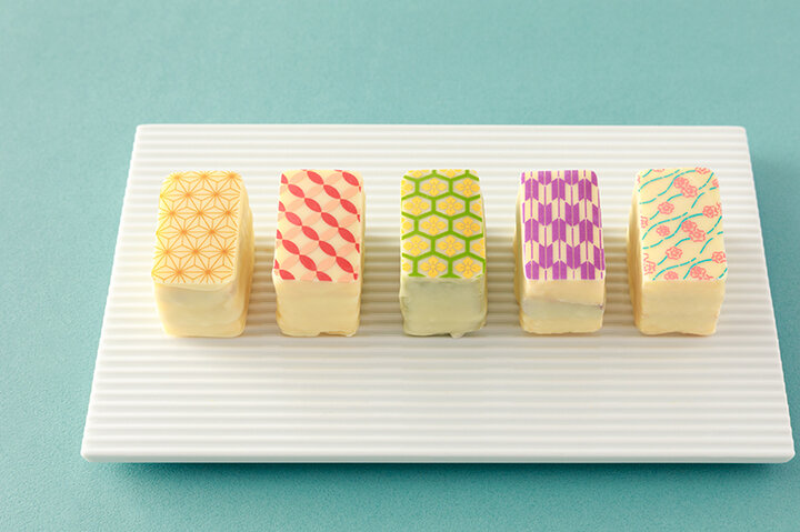 ホワイトチョコレートがけのケーキに美しい文様が描かれた「kimono」。着物というその名の通り、古くから和装や家紋に使われる縁起柄をモチーフに落とし込んだプチケーキです。 ホワイトチョコレートの中はしっとりした口当たりのスポンジ生地。文様によってフレーバーが異なり、あんこや抹茶のクリーム、フルーティーなジャムや香ばしいナッツを使った層が生地に挟み込まれています。