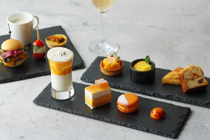 今回のアフタヌーンティーでは、仕入れてから追熟させペストリーシェフが食べごろを見極めた、旬のマンゴー2種を使用。濃いオレンジ色で甘みが深く香り高い「メキシカンマンゴー」と酸味の強い「フィリピンマンゴー」という品種の特長を使い分けており、マンゴー杏仁豆腐、マンゴーのマカロン、マンゴーのショコラ、マンゴープリンなど、味や食感に変化を持たせたスイーツと、ジャガイモのポタージュ、ムール貝のイエローカレーキッシュなどのセイボリーを堪能できます。 New American Grill “KANADE TERRACE”にて、マンゴーの魅力を存分に楽しんでくださいね。