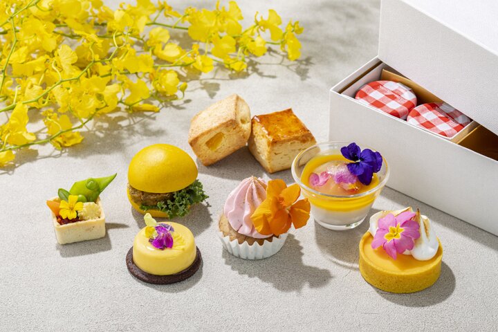 アフタヌーンティーでは、ピタヤ(ドラゴンフルーツ)の深紅のゼリーが鮮やかな「ピタヤ&ジャスミンゼリー」、アーモンドミルクの優しい甘さにライムゼリーの酸味が心地良い「アーモンドミルクパンナコッタ」、チョコレートタルトとともに楽しむ「マンゴームース」などのスイーツ5種(うちヴィーガン3種)と、黄色のバンズにひよこ豆コロッケをサンドした「ファラフェルミニバーガー」などが味わえます。 また「ドルチェ・フィオーリ・アフタヌーンティー」のスイーツ4種、セイボリー2種、スコーン2種をロンネフェルト社の紅茶やハーブティーとともに持ち帰ることができるオリジナルテイクアウトボックスも販売。自宅でのティータイムにはもちろん、ギフトにもぴったりの逸品です。