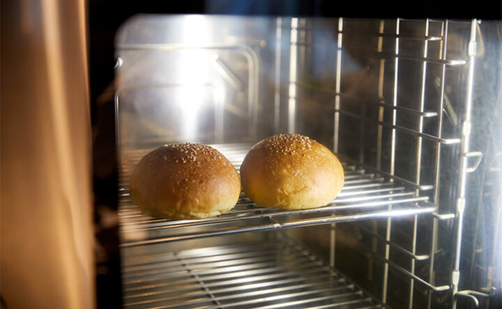 バンズに使うパン生地は、仕入先から半生状態で届き、注文が入ってから店内に設置されたスチームオーブンで焼き上げています。