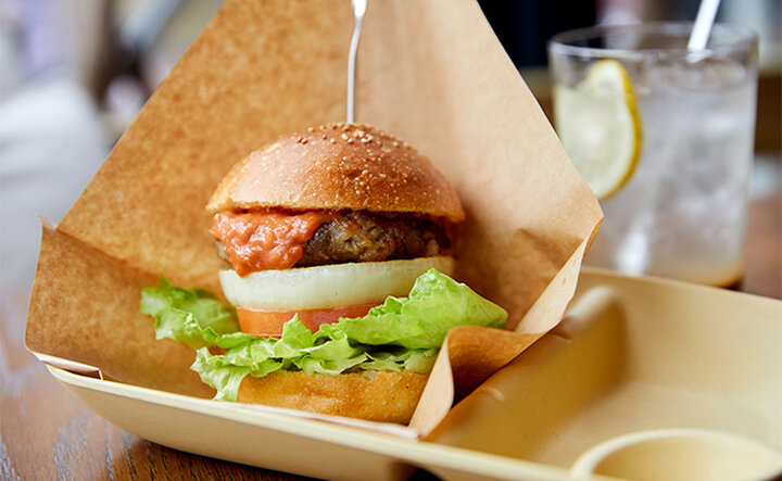 「クラフトヴィレッジ西小山」にお店を構えた理由の1つに、「地球や環境保護にも配慮したサステナブルの試みが施設全体のコンセプトでもあったから」と答えてくれた渡邉さん。 「自由が丘の本店でも『今の子どもたちに明るい未来が残るように』と、サステナブルに力を入れており、小さくてもコツコツとした取り組みが大切という思いでいます」。 ハンバーガーにはさむ玉ねぎの端材も捨てずにソースに使用したり、カトラリーやコップ、皿も土に還る素材のものを使っているほか、スタッフのユニフォームもリサイクル100%の素材で作ってもらったとのこと。 「エコの観点から、ドリンク類にはストローをつけずに提供していますが、ご希望があればサトウキビで作られたストローをお渡ししています」。 店内もグリーンや流木をインテリアに使うなど、ナチュラルでエコな印象です。ジャンクフードのイメージを覆してくれる、体に優しい素材を使ったボリューミーなハンバーガーとクラフトコーラ。罪悪感は一切感じないままに、お腹と心を満たしてくれました。