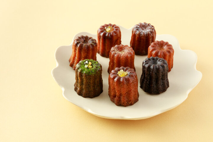 プレーンをはじめ、プレーン、カカオ、いちじくくるみ、抹茶、クランベリー、ネーブルショコラ、アールグレイ、ラムレーズンなど季節ごとに変わるフレーバーはそれぞれの味わいがしっかりと感じられ、トッピングのコンフィチュールなどがアクセントになっています。好きなフレーバーをあれこれ悩みながら選ぶのも楽しいひとときです。 かざらない友人へのおみやげに、おうち時間のちょっとしたおやつにちょうどいいかわいいプチカヌレ。楽しいティータイムのおともにぴったりのスイーツです。