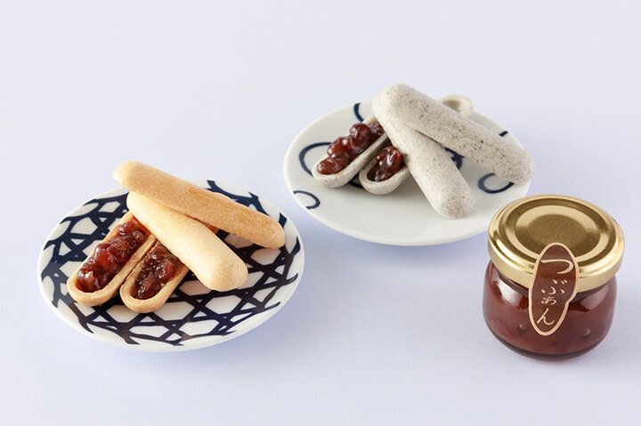 箱の中には、瓶詰めの粒餡とスティック状のもなかの皮が入っています。自慢の皮はプレーンとごまの2種類。プレーンはパリッとした軽やかな食感、ごまは香ばしく風味豊かな香りが特徴です。ポテトサラダやチーズなどとも相性が良く、お酒のお供にもおすすめです。 可愛らしい瓶に入った手作りの粒餡は、優しい甘さでパリパリの皮との相性抜群。餡をたっぷりと入れて皮でフタをするのも良し、トッピングを追加してカナッペのようにするのもよし。食べ方自由自在で楽しめる、皮が主役のもなかを味わってみませんか?
