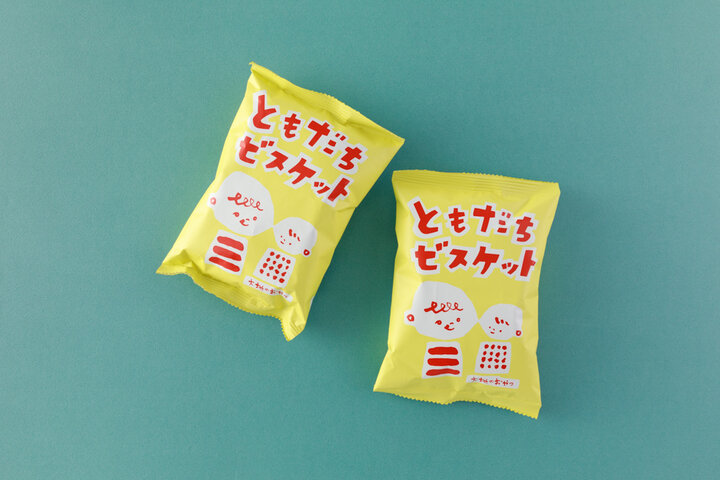 柔らかくて、あったかくて、ほのぼのとするイラストが魅力の「ともだちビスケット」。黄色いパッケージに描かれているのは、2人のともだちです。「いつでもそばに」そんな想いを込めて、「ともだちビスケット」と名付けられました。 こちらは、和菓子職人「まっちん」こと町野仁英さんと岐阜の老舗油問屋「山本佐太郎商店」が手掛ける「大地のおやつ」シリーズの一つです。その味わいは、シリーズの中でもひときわ素朴でシンプル。子どもの頃の懐かしい思いにほっこり浸りながら、ぱくっと頬張りたくなります。