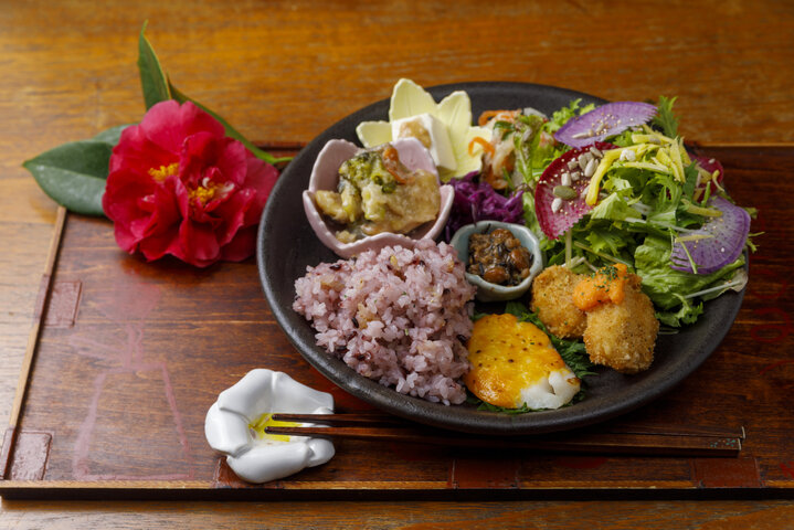 料理はすべて手作り。ランチタイムには「えんの糀プレート」がおすすめです。一皿にさまざまなメニューが盛り付けられており、添えられた季節の花に癒されます。旬の野菜をはじめ、肉や魚などに発酵調味料を取り入れ、栄養満点。プレートの内容は2か月ごとに変わります。