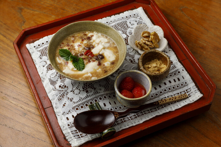 カフェタイムに味わえるスイーツにも糀が使われています。 台湾スイーツの豆花には甘酒を使い、やさしい甘さに。季節のフルーツやきなこ、くるみが添えられているので、さまざまな味を楽しめるのもうれしいですね。