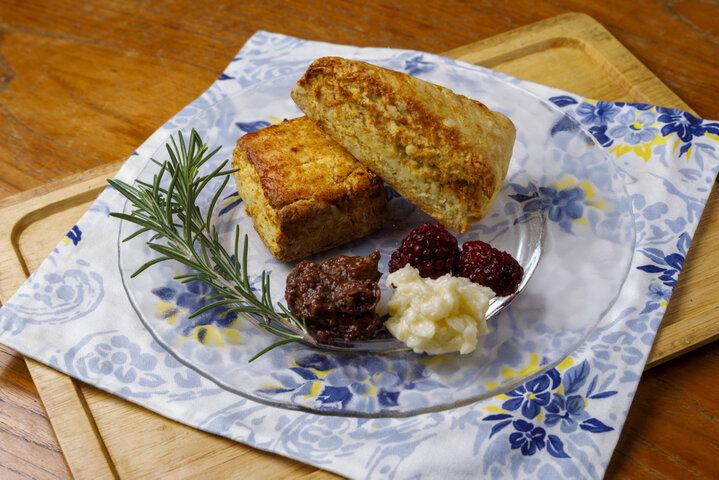 スコーンは2種。甘酒を使ったほどよい甘さのものと、酒粕を使いほんのりチーズのような風味を感じるものがあります。バナナ、チョコ、甘酒を組み合わせたディップや甘酒のバターと一緒に味わうのもおすすめ。