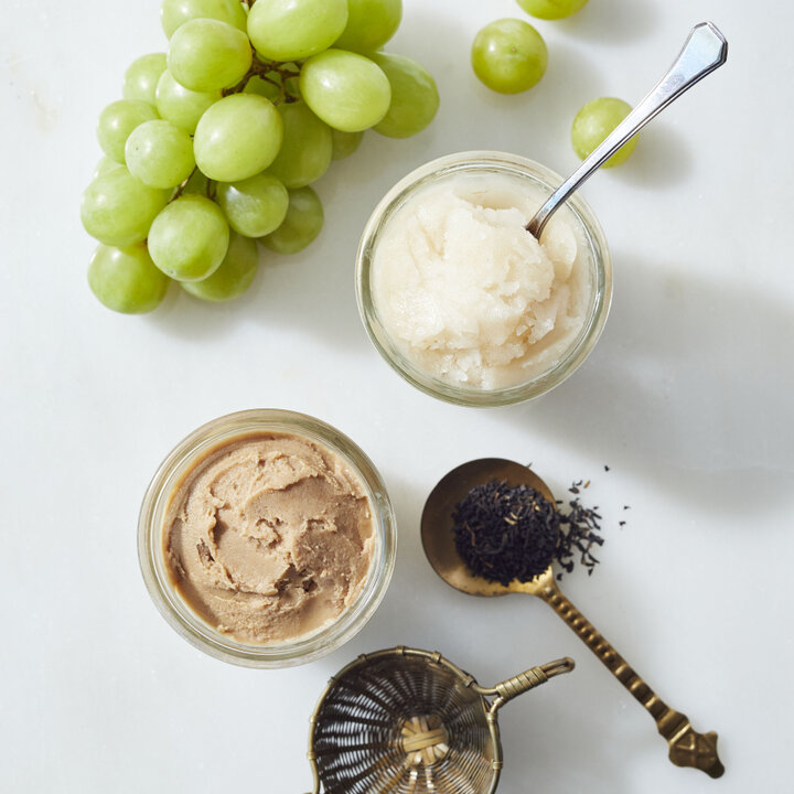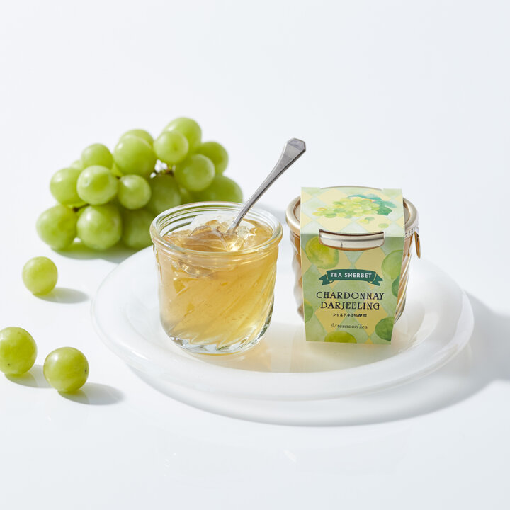 「ティーシャーベット シャルドネダージリン」は、凍らせて楽しむデザートシャーベット。爽やかなシャルドネ果汁とぶどうの果肉に、ダージリンを合わせたアフタヌーンティー人気の味を、グラスデザートに仕上げています。冷やしてゼリーとしても楽しむことができます。