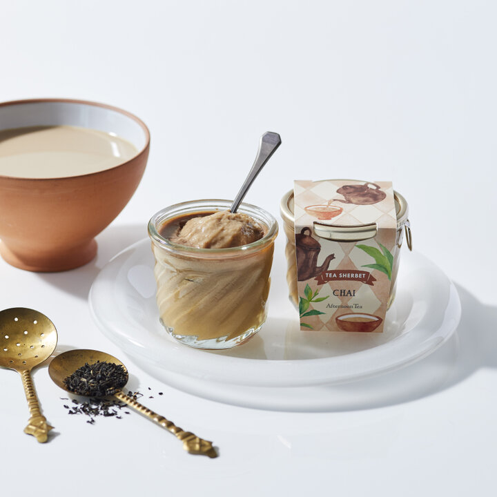 「ティーシャーベット チャイ」は、アフタヌーンティーで人気のチャイをイメージした、ミルクベースのグラスデザート。凍らせて楽しむほか、冷やしてチャイプリンとしても味わえます。