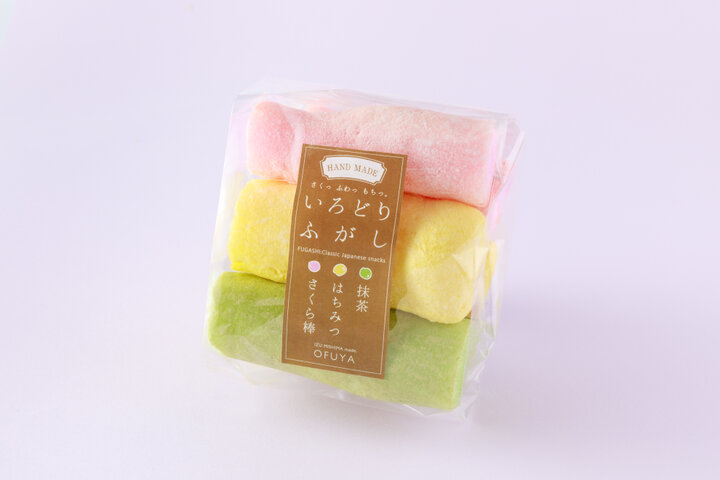 こちらを手がけているのは、静岡県三島市で麩菓子・焼き麩を作っている「麩の菓 おふや」。初代は製麺業としてスタート、2代目で製麩を始め、現在の3代目で製麺業を廃業。「おふや」がスタートしたのは2013年から。その後、2019年に「麩の菓 おふや」として再スタートさせました。 お麩はその昔、お坊さんがたんぱく源として食べていた栄養価の高いもの。カロリーが低く吸収率も高いので、離乳食や介護食としても重宝されてきました。 「3色のいろどりふがし」は、ぱくぱく食べても、罪悪感のないおやつ。カロリーが気になる女性や、健康を気遣う方へのギフトや手土産などにも喜ばれそうですね。