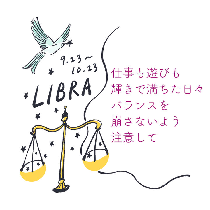 自分の内なるエネルギーに突き動かされるように、遊びも仕事も感性の赴くままに行動したくなる時期。新しい仕事が舞い込んできたり、趣味で始めたコミュニティが話題になり出会いの和が広がったりと、ワクワク&ドキドキで満ちたエキサイティングな毎日を送っていることでしょう。 ただ、調子に乗るとタガが外れ思わぬしっぺ返しをくらうハメに。急に体調を崩してダウンしたり、大事なプレゼンで大失敗したりと、目も当てられないほど大きなビハインドを負ってしまうことも。  天秤座は一方の天秤が壊れてバランスを崩すと、元に戻るまでに多くの時間を要します。 昼夜を忘れ仕事に集中しすぎたり、趣味に没頭しすぎるのではなく、食生活を正すなど日々の生活を整える時間も大切にすると、物事がうまく回り出しますよ。