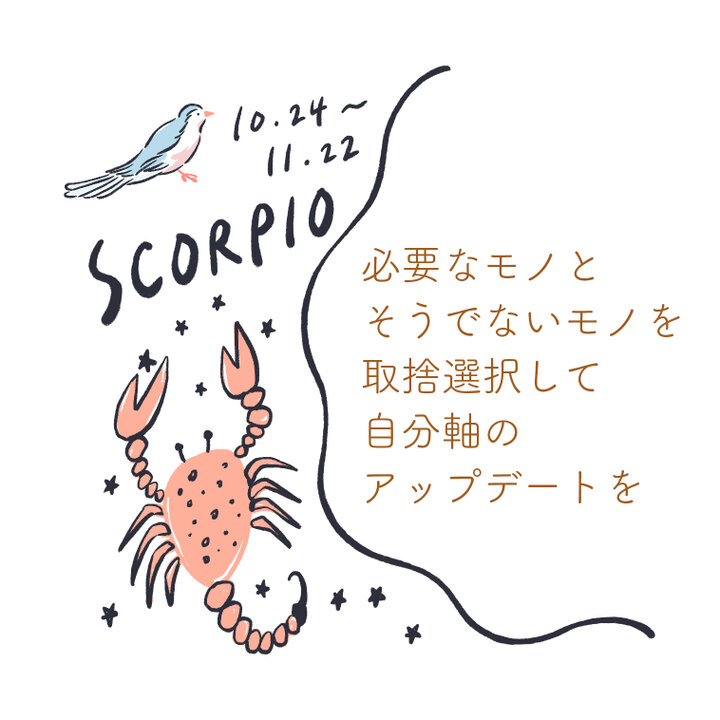 周りのノイズをシャットアウトして、心の鎧を脱いで自分と向き合う時間を作りましょう。水のエレメントを持つさそり座さんは、ゆったりと半身浴をしながらの自問自答もおすすめ。バスソルトを入れて、好きな音楽を流しながら、心の声に耳を傾けてみて。その時にふってきたひらめきが、次からいいパフォーマンスを出すためのヒントになりそう。