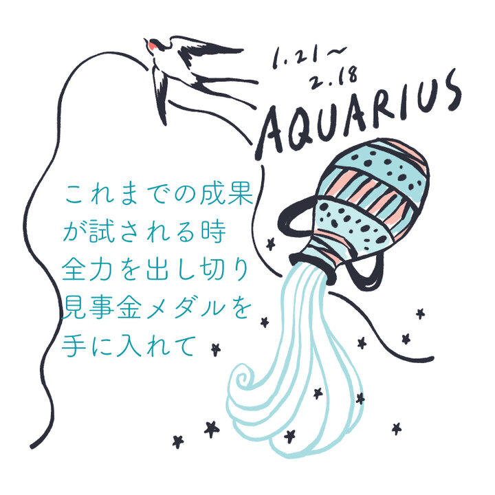 風の時代の始まりと共に好スタートを切り、星たちからの祝福を一身に受けているみずがめ座さん。結婚、妊活、転職など人生の節目となる事柄を体験している人も多いのでは?仕事もプライベートも、スポットライトを浴びるような充実した毎日を送っていることでしょう。 今年はあなたにとってもオリンピックイヤー。今まで自分が蓄えてきたものをすべて出し切って、見事ゴールドメダルを手に入れて。 ただ、昨年からの新型コロナウィルスのパンデミックなどで、追い風を感じにくいのも確か。うまく風の時代の波を捉えられてないと感じたら、まずはTO DO リストを作りましょう。トライしたいことをエネルギッシュに片っ端から実現、一気に上昇気流に乗り、新たなる高みへ。 2022年はこの半年で築いたことがあなたのスタンダードになります!輝かしいチャンスの泉を手に入れ、収入アップのプレゼントも期待できそう♪