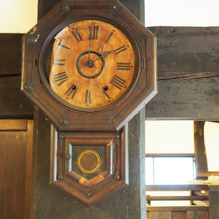 むき出しになった梁や柱は当時のまま。重厚感の中にも郷愁が漂う店内は、初めてでもほっと落ち着きます。 席はテーブル席の他に、昔話に出てきそうな囲炉裏の席も。座ってみると、懐かしくて温かくて。自然と会話が弾む、ほっこり癒やされる空間です。