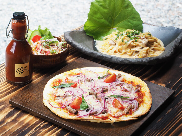 「自家製ベーコンのピザ」(1200円)、「白鳳みそ仕立ての生パスタ(サラダ付き)」(1400円)