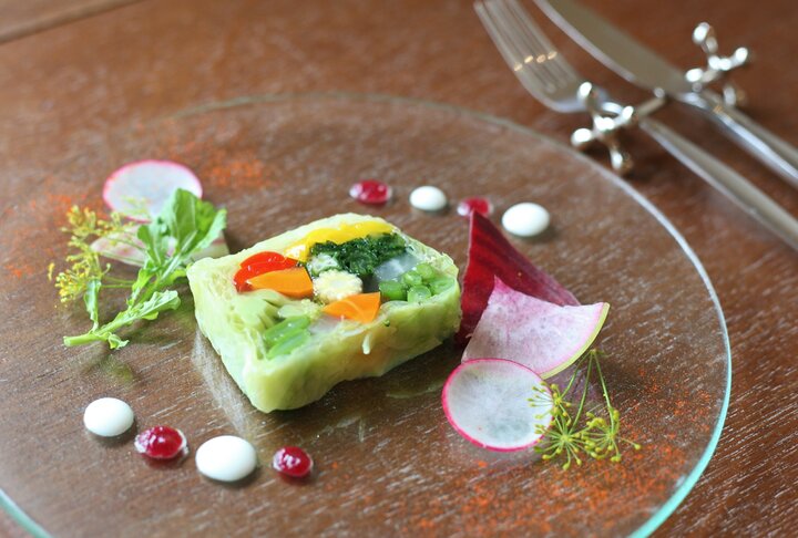 ランチの定番人気は特製カレーや奥三河地鶏つくねバーグのプレート。季節限定のメニューなど3~4種類から選ぶことができます。すべてのランチに前菜として野菜のテリーヌが付いていて、季節の野菜の彩り豊かな断面が食欲をそそりますよ。テリーヌは野菜ダシのジュレで冷やし固めた一品で、夏は色の濃い野菜が多いので特に映えるのだそう。