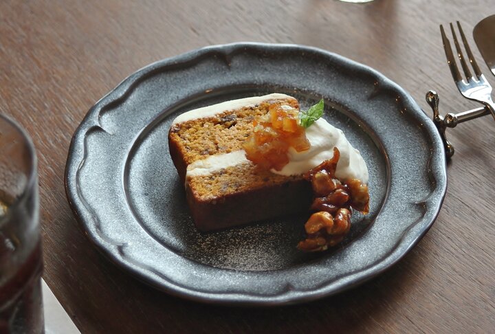 スイーツも「季節のフルーツタルト」など、旬の食材の美味しさを楽しめる品々が並んでいます。人参やナッツでリッチな味わいに仕上げた「キャロットケーキ」はお店の定番スイーツ。自家製のオレンジピールやキャラメルナッツと一緒に食べればホームメイドの優しい味わいが口に広がります。
