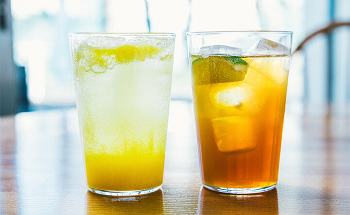 左から、みかんと青柚子を使った「発酵ジュース」と優しい甘みと香ばしさが特徴の「ほうじ茶コーラ」。