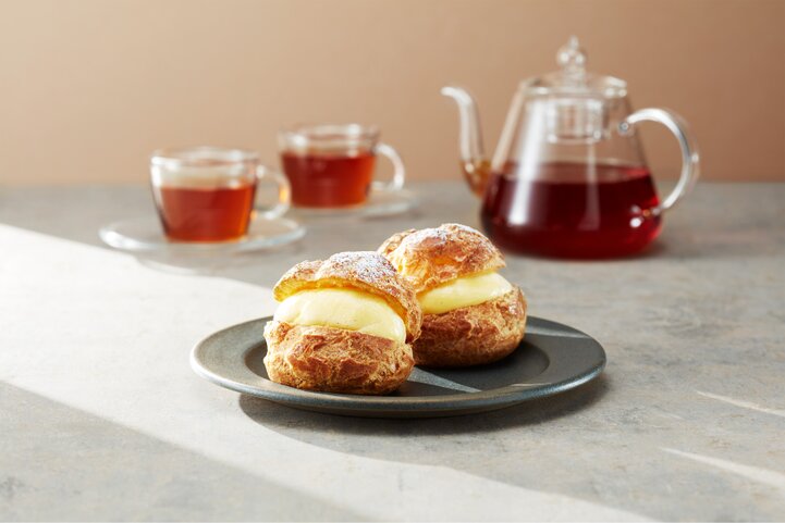 「シュークリーム」は、特製カスタードクリームと生クリームを、あえて混ぜすぎずに仕上げているのが特徴で、2つの味のグラデーションが楽しめます。昔ながらのふんわりとやわらかな食感のシュー生地で、2つのクリームを包みこんでいます。