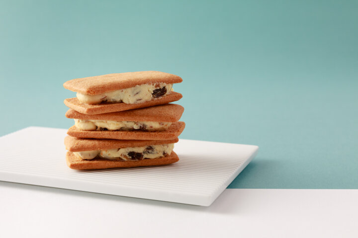 たっぷり厚みのあるクリームをはさんだ「フェルム ラ・テール 美瑛」の「バターチーズサンド」。クリームのライトな食感とまろやかな味わい、フレーバーの豊富さが魅力です。 クリームが軽やかなのは、空気をしっかり含ませた北海道産のバターにクリームチーズをブレンドしているから。「ダブルチーズ」は、北海道産クリームチーズと北海道産マスカルポーネ、2種のチーズのミルキーなコクを楽しめます。「抹茶と黒千石」は、“幻の大豆”といわれる北海道産の大粒の黒豆・黒千石を使用。ほろ苦い抹茶味のクリームに黒豆のホクホクした食感がアクセントです。