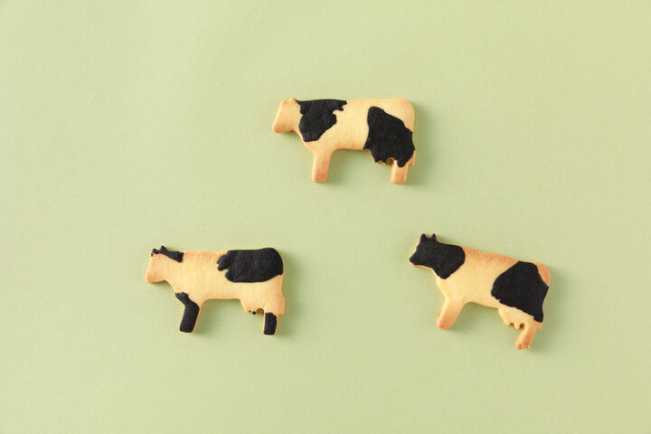 クラフト紙にホルスタインの柄が描かれた箱の中に入っているのは、白いからだに、黒い模様が施された牛の形のサブレ。バターがふんわり香る生地はサクッとした口当たりで甘すぎず、柄の黒はブラックココア風味。素材の良さを感じるシンプルながらもリッチなおいしさです。ネーミングもそのまま「うしサブレ」というこのサブレ。ほのぼのとかわいらしいので、思わず並べてみると、驚くことに1枚1枚の模様が違います。実はこのサブレは工房での手作り。ひとつとして同じ柄はないのだそうです。