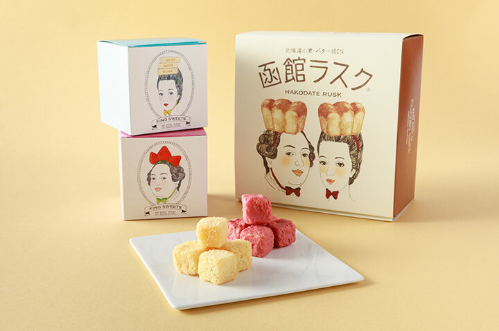 異国情緒あふれる貴婦人のイラストが特徴の「函館ラスク」。貴婦人の帽子が、各フレーバーの絵になっている、レトロなパッケージがとてもキュートです。 1929(昭和4)年にパン屋として創業した「キングスイーツ」。北海道産小麦・バターを使った、自慢の手作り食パンは地元の人に大人気です。その食パンを使った「函館ラスク」は、サクサクとした軽やかな食感でやみつきになるおいしさです。