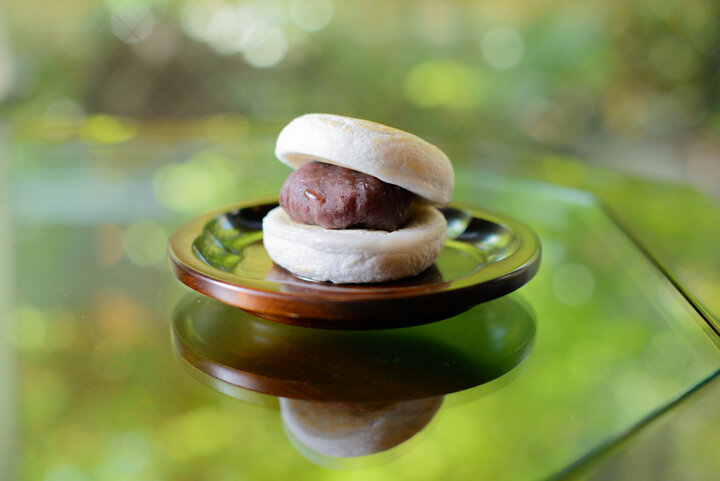 「かさの家」で密かに裏メニューとして提供されていた「かさね餅」もグランドメニューとして提供しています。こちらはたっぷりの餡子を、梅ヶ枝餅でサンド。その昔、持ち帰りの梅ヶ枝餅に、余っていた餡子をサービスで渡していた常連客が2つの梅ヶ枝餅の間にその餡子を挟んで食べていたというエピソードからメニュー化されたそう。あんこ好きにはたまらない、まさにあんこ尽くしの一品です。