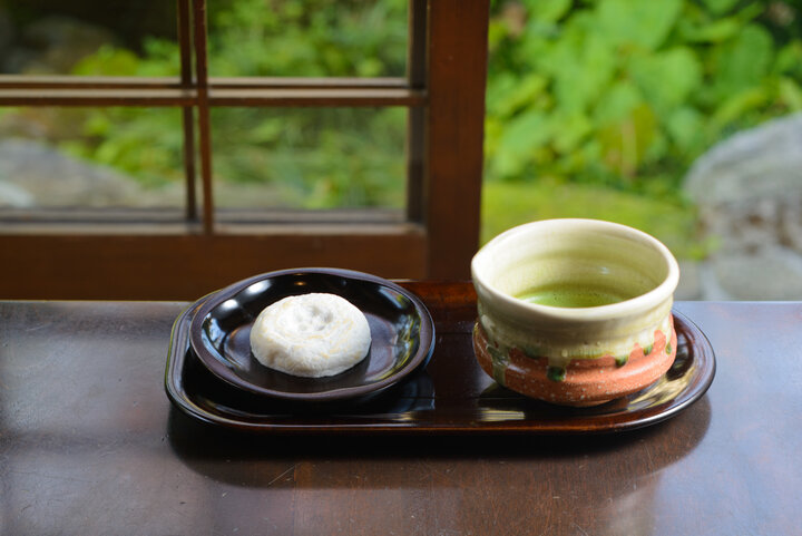 焼きたての梅ヶ枝餅は、食べ歩きするのはもちろん、喫茶スペースでお抹茶と味わうのもおすすめ。湯布院から移築された築100年以上の古民家を改装した喫茶スペースで、庭園を眺めながらのんびりくつろげます。併設するショップでは、菅原道真が愛した梅の花をモチーフにしたみやげ品も販売してますよ。