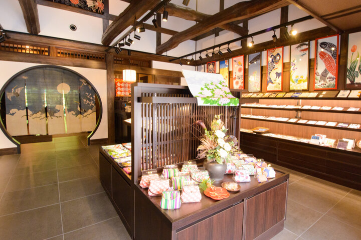 2020年に建て直し、和を基調に、ヨーロッパ調の家具を取り入れた大正ロマン風の内装にリニューアルされた店内。和洋さまざまな柄の手ぬぐいが華やかに展示されています。