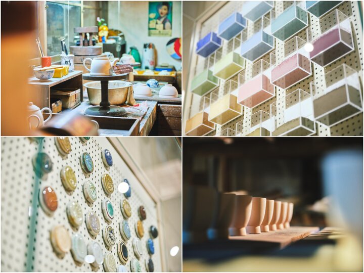 (左上、右下)絵付けをする場所や棚の上で製品を乾かす様子など、細部まで作り込まれたモロの内部 (右上)近代から使われるようになった上絵付用の絵具サンプル。低温で焼くと見たままの色に仕上がる (左下)釉薬のテストに使用したと思われるピース