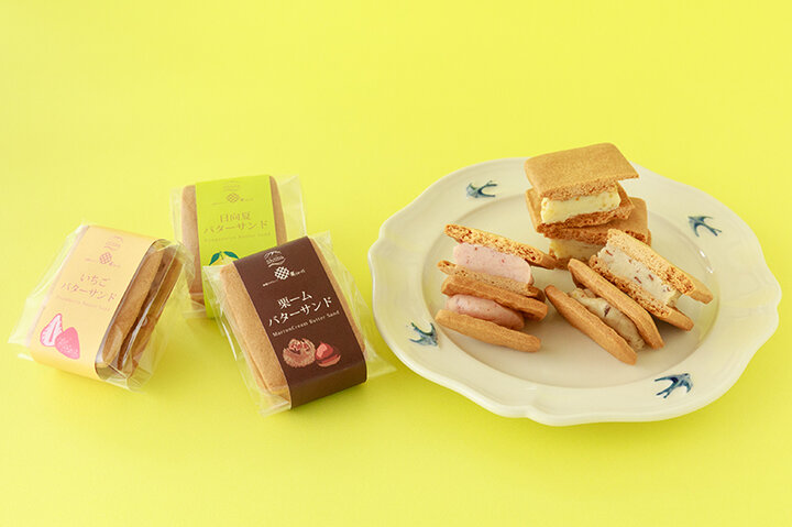クラフトボックスの中に並ぶのは5種類のバターサンド。バターの風味を壊さないように冷蔵便で到着するので、ひんやりとした食感のバターが、口の中でじんわりと溶けて深みのある味わいが広がります。 濃厚な栗の風味の「栗ームバターサンド」、苺の果肉感がしっかり感じられる「いちごバターサンド」、日向夏ピールが爽やかな「日向夏バターサンド」は、どれも宮崎県産の果実をふんだんに使ったフルーツバターをサンド。果実ならではのフレッシュな味わいです。 すべてのバターサンドには、原料の生クリームを36時間かけて発酵熟成させて作られた高千穂発酵バターを使用。発酵バターならではの香りとコクがリッチな気分を高めます。