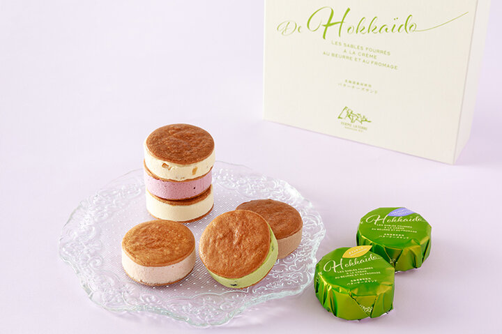 たっぷり厚みのあるクリームをはさんだ「フェルム ラ・テール 美瑛」の「バターチーズサンド」。クリームのライトな食感とまろやかな味わい、フレーバーの豊富さが魅力です。 クリームが軽やかなのは、空気をしっかり含ませた北海道産のバターにクリームチーズをブレンドしているから。「ダブルチーズ」は、北海道産クリームチーズと北海道産マスカルポーネ、2種のチーズのミルキーなコクを楽しめます。「抹茶と黒千石」は、“幻の大豆”といわれる北海道産の大粒の黒豆・黒千石を使用。ほろ苦い抹茶味のクリームに黒豆のホクホクした食感がアクセントです。