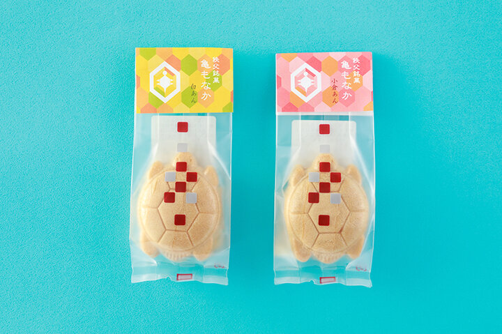 コロンと丸く愛らしい形に思わず笑みがこぼれる「亀もなか」。さっくりとしたもなかの中には、しっとりと上品な甘みの白あんと、小豆の食感が際立つ小倉あんが、それぞれたっぷりと餡がつまっています。 亀は長寿の願いを込めた縁起物。年配の方への贈り物としても購入される方も多く、個包装なのも嬉しいポイントです。