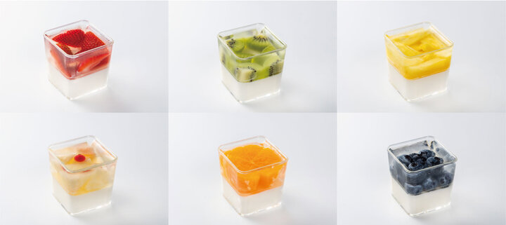 今回新発売された「フルーツジュエル」は、大きさや見た目、色鮮やかなフルーツの輝きがまるで宝石箱のような、5cm×5cm×5cmの手のひらサイズのキューブ型に入ったフルーツゼリーです。 なめらかでクリーミーなバニラムースの上に、ジューシーなフルーツをトッピングし、さっぱりとしたゼリーで閉じ込めています。箱を開けたときにフルーツが可愛らしく、美しく映えるよう、キューブの大きさやフルーツのトッピング・カット方法にもこだわった商品です。