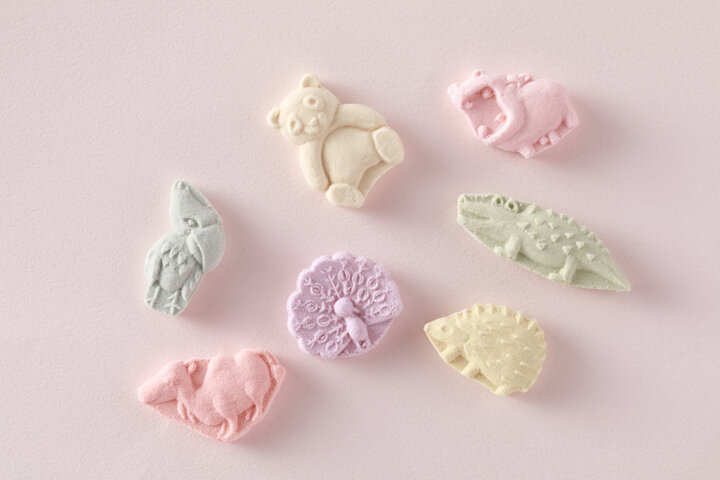 足跡模様があしらわれたパッケージをそっと開けると、現れたのはパステルカラーのかわいい動物たちの和三盆。すべて異なる種類がパズルのように敷き詰められています。カピバラの毛並みやクジャクの羽模様など、動物たちの特徴がキュートに表現されて、どれを選ぼうか迷ってしまうほど。 ひとつ口に運ぶとさらりとまろやかに溶け、あとに広がるのはじんわり優しい甘さ。緑茶だけでなくコーヒーやストレートティーなどともよく合う和三盆は、飲み物の良さも引き立てる、素敵なお茶のおともです。