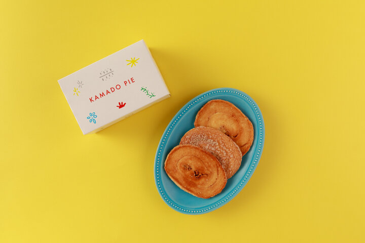 厳選したバターを使用し、ひとつひとつ手作業で練り上げた「かまどパイ」。封を開けるとこっくりしたバターと甘い砂糖の香りがふわっと広がります。 パイ菓子の特徴ともいえる層になった生地は、サクサクの食感。中央のくるみのカリっとした口当たりもアクセントを生み出しています。工場では、薄く伸ばした生地の上にくるみをのせて一つひとつ手作業で巻いているのだとか。空気を含みすぎないパイ生地は、クッキーのような食べ応えも感じられます。