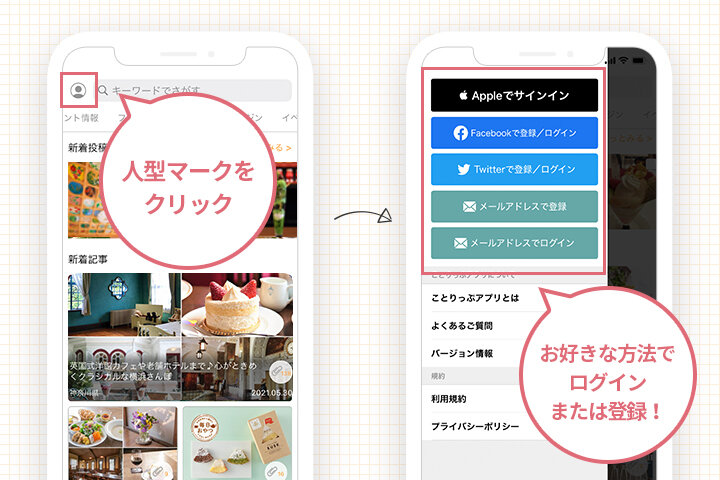 ②トップ画面の左上にある「人型マーク」をタップすると、ソーシャルアカウントまたはメールアドレスで登録/ログインできます。