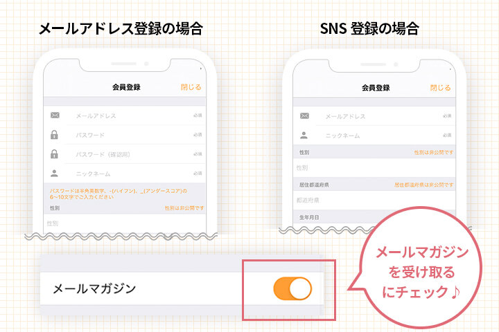 ②メールアドレスでの登録の場合は下記ページにご記入の上、メルマガ会員になる場合はメールマガジンを「受け取る」を選択してください。