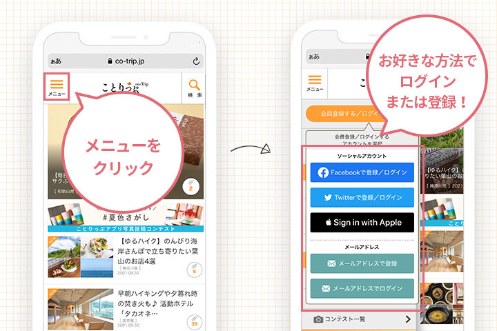 ①トップ画面の左上の「メニュー」をタップすると「会員登録する/ログインする」という表示が出ます。その表示をタップすると、ソーシャルアカウントまたはメールアドレスで登録/ログインできます。